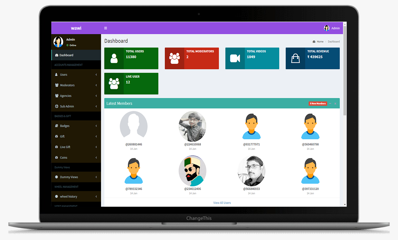 This is the main Dashboard of the admin panel, Where we can see all the modules, Chart and Side menu.